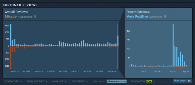 As the graph below shows, those gratitude grenades (that’s the opposite of a review bomb, folks) have left the game with a recent review rating of ‘very positive,’ compared to its overall ‘mixed’ rating.