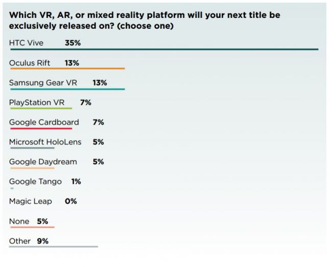 35 percent of devs working on a platform exclusive said it would release exclusively on Vive, 13 percent said Oculus Rift, and another 13 percent said Samsung’s Gear VR headset. 9 percent said “Other,” and just 7 percent said Sony’s PlayStation VR.